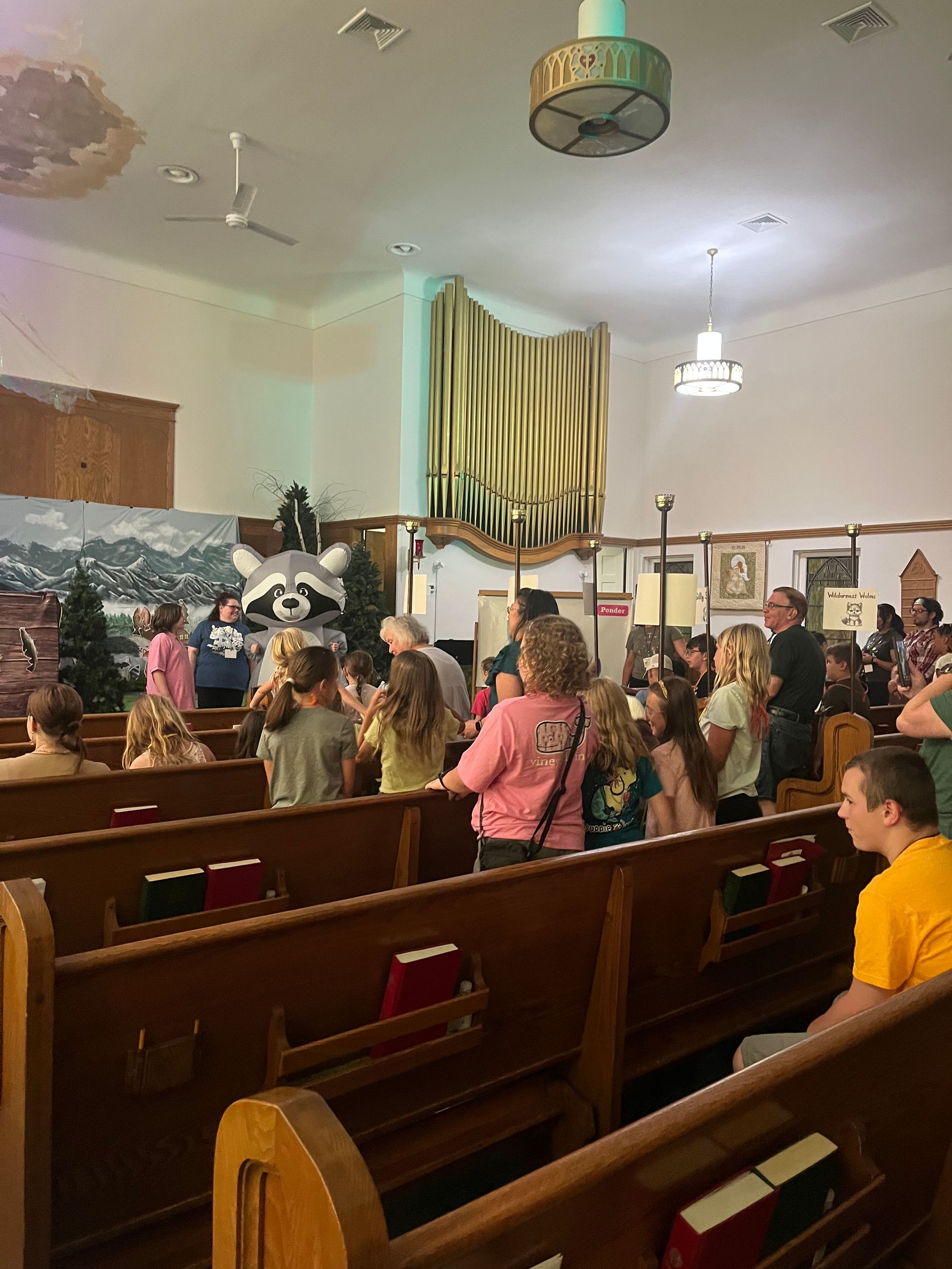 Rocky the Raccoon and group at Day 1 of VBS 2025